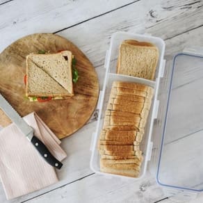 O pote vem com um separador de fatias móvel que pode ser acoplado ao Porta Pão de Forma para separar fatias ou mesmo como divisória para armazenar mais de um tipo de alimento.