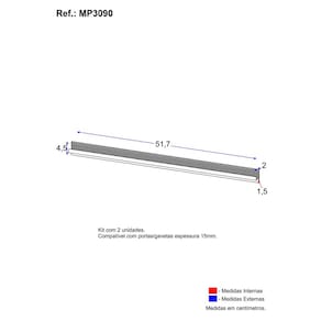 Dimensões de cada puxador: Altura: 4,5cm | Largura: 51,7cm | Profundidade: 2cm * Você pode consultar as medidas detalhadas na imagem técnica do produto. * Tamanho indicado para os parafusos: 3,5x12mm * Quantidade total necessária de parafusos: 6