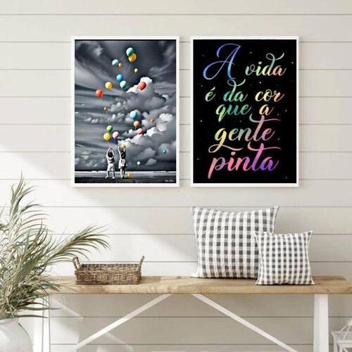 Kit 2 quadros a vida tem a cor que a gente pinta 45x34cm - com vidro Moldura: madeira branca Informações do produto tire todas as suas dúvidas no descritivo abaixo: decoração para quarto, sala, cozinha, escritório, área gourmet e muito mais. Chega de paredes vazias medidas - cada peça tem 45x34cm a3 . Material do papel - papel fotográfico brilhante de altíssima resolução acabamento - todos os quadros são acompanhados de vidro para proteção da imagem. - moldura em madeira maciça na cor preta ou branca conforme produto escolhido e pendurador . - os quadros são embalados de forma segura com plástico bolha com camada dupla de acordo com o tamanho dos quadros. Garantia - garantia de 3 meses. Meu quadro chegou. Como posso fixá-lo Você precisa apenas de um martelo e um prego, pois os quadros já vão acompanhados de penduradores. Esta é a forma mais indicada. Como posso limpar meu quadro A limpeza é feita como um móvel comum da sua casa. Apenas um pano seco ou espanador são suficientes para tal