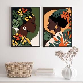 O Kit 2 Quadros Mulheres Black African Woman 45x34cm - Vidro é perfeito para decorar o seu ambiente com estilo e personalidade. Com moldura de madeira preta, esses quadros têm um tamanho ideal de 45x34cm A3 para preencher as paredes vazias do seu quarto, sala, cozinha, escritório, área gourmet e muito mais.