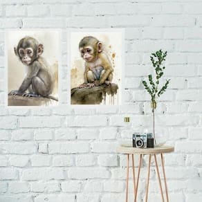 Kit 2 quadros aquarela macaquinho 24x18cm - com vidro Moldura: madeira preta Informações do produto tire todas as suas dúvidas no descritivo abaixo: decoração para quarto, sala, cozinha, escritório, área gourmet e muito mais. Chega de paredes vazias medidas - cada peça tem 24x18cm a5 . Material do papel - papel fotográfico brilhante de altíssima resolução acabamento - todos os quadros são acompanhados de vidro para proteção da imagem. - moldura em madeira maciça na cor preta ou branca conforme produto escolhido e pendurador . - os quadros são embalados de forma segura com plástico bolha com camada dupla de acordo com o tamanho dos quadros. Garantia - garantia de 3 meses. Meu quadro chegou. Como posso fixá-lo Você precisa apenas de um martelo e um prego, pois os quadros já vão acompanhados de penduradores. Esta é a forma mais indicada. Como posso limpar meu quadro A limpeza é feita como um móvel comum da sua casa. Apenas um pano seco ou espanador são suficientes para tal