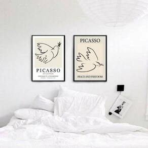 Kit 2 quadros arte picasso pomba da paz 33x24cm - com vidro Moldura: madeira branca Informações do produto tire todas as suas dúvidas no descritivo abaixo: decoração para quarto, sala, cozinha, escritório, área gourmet e muito mais. Chega de paredes vazias medidas - cada peça tem 33x24cm a4 . Material do papel - papel fotográfico brilhante de altíssima resolução acabamento - todos os quadros são acompanhados de vidro para proteção da imagem. - moldura em madeira maciça na cor preta ou branca conforme produto escolhido e pendurador . - os quadros são embalados de forma segura com plástico bolha com camada dupla de acordo com o tamanho dos quadros. Garantia - garantia de 3 meses. Meu quadro chegou. Como posso fixá-lo Você precisa apenas de um martelo e um prego, pois os quadros já vão acompanhados de penduradores. Esta é a forma mais indicada. Como posso limpar meu quadro A limpeza é feita como um móvel comum da sua casa. Apenas um pano seco ou espanador são suficientes para tal