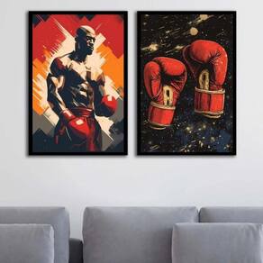 Kit 2 quadros artes boxe - lutador e luvas 33x24cm - com vidro