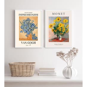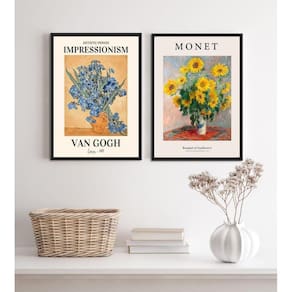 Kit 2 quadros artes monet e van gogh- flores 24x18cm - com vidro Moldura: madeira preta Informações do produto tire todas as suas dúvidas no descritivo abaixo: decoração para quarto, sala, cozinha, escritório, área gourmet e muito mais. Chega de paredes vazias medidas - cada peça tem 24x18cm a5 . Material do papel - papel fotográfico brilhante de altíssima resolução acabamento - todos os quadros são acompanhados de vidro para proteção da imagem. - moldura em madeira maciça na cor preta ou branca conforme produto escolhido e pendurador . - os quadros são embalados de forma segura com plástico bolha com camada dupla de acordo com o tamanho dos quadros. Garantia - garantia de 3 meses. Meu quadro chegou. Como posso fixá-lo Você precisa apenas de um martelo e um prego, pois os quadros já vão acompanhados de penduradores. Esta é a forma mais indicada. Como posso limpar meu quadro A limpeza é feita como um móvel comum da sua casa. Apenas um pano seco ou espanador são suficientes para tal
