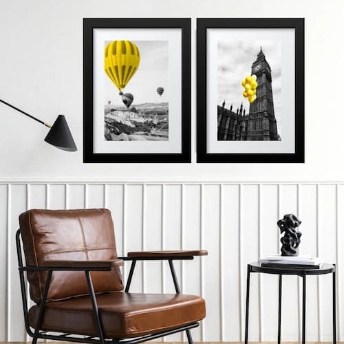 Kit 2 quadros balões amarelos - 60x48cm Moldura: madeira branca Informações do produto tire todas as suas dúvidas no descritivo abaixo: decoração para quarto, sala, cozinha, escritório, área gourmet e muito mais. Chega de paredes vazias medidas - cada peça tem 60x48cm . Material do papel - papel fotográfico brilhante de altíssima resolução acabamento - todos os quadros são acompanhados de vidro para proteção da imagem. - moldura em madeira maciça na cor preta ou branca conforme produto escolhido e pendurador. - paspatur branco com 7cm de largura - os quadros são embalados de forma segura com plástico bolha com camada dupla de acordo com o tamanho dos quadros. Garantia - garantia de 3 meses. Meu quadro chegou. Como posso fixá-lo Você precisa apenas de um martelo e um prego, pois os quadros já vão acompanhados de penduradores. Esta é a forma mais indicada. Como posso limpar meu quadro A limpeza é feita como um móvel comum da sua casa. Apenas um pano seco ou espanador são suficientes para tal Ean: 7893567227965