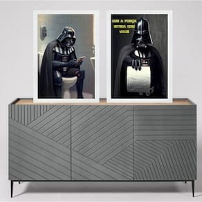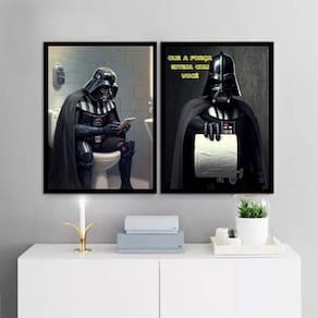 Kit 2 quadros banheiro do darth 33x24cm - com vidro Cor: moldura branca Informações do produto tire todas as suas dúvidas no descritivo abaixo: decoração para quarto, sala, cozinha, escritório, área gourmet e muito mais. Chega de paredes vazias medidas - cada peça tem 33x24cm a4 . Material do papel - papel fotográfico brilhante de altíssima resolução acabamento - todos os quadros são acompanhados de vidro para proteção da imagem. - moldura em madeira maciça na cor preta ou branca conforme produto escolhido e pendurador . - os quadros são embalados de forma segura com plástico bolha com camada dupla de acordo com o tamanho dos quadros. - de 3 meses. Meu quadro chegou. Como posso fixá-lo Você precisa apenas de um martelo e um prego, pois os quadros já vão acompanhados de penduradores. Esta é a forma mais indicada. Como posso limpar meu quadro A limpeza é feita como um móvel comum da sua casa. Apenas um pano seco ou espanador são suficientes para tal Marca: Não Informado Ean: 7896270128444