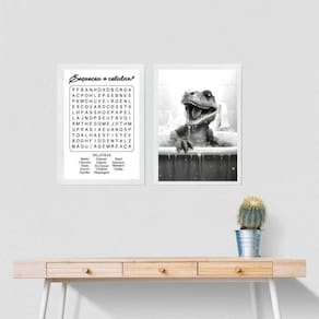 Kit 2 quadros banheiro infantil - dinossauro 24x18cm - com vidro Moldura: madeira preta Informações do produto tire todas as suas dúvidas no descritivo abaixo: decoração para quarto, sala, cozinha, escritório, área gourmet e muito mais. Chega de paredes vazias medidas - cada peça tem 24x18cm a5 . Material do papel - papel fotográfico brilhante de altíssima resolução acabamento - todos os quadros são acompanhados de vidro para proteção da imagem. - moldura em madeira maciça na cor preta ou branca conforme produto escolhido e pendurador . - os quadros são embalados de forma segura com plástico bolha com camada dupla de acordo com o tamanho dos quadros. Garantia - garantia de 3 meses. Meu quadro chegou. Como posso fixá-lo Você precisa apenas de um martelo e um prego, pois os quadros já vão acompanhados de penduradores. Esta é a forma mais indicada. Como posso limpar meu quadro A limpeza é feita como um móvel comum da sua casa. Apenas um pano seco ou espanador são suficientes para tal