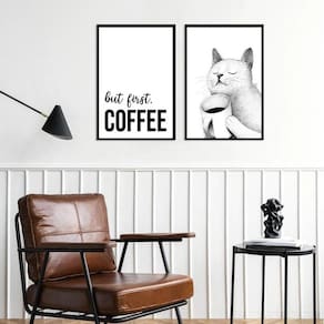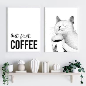 Kit 2 quadros café gato - but first coffee 60x48cm Moldura: madeira preta Informações do produto tire todas as suas dúvidas no descritivo abaixo: decoração para quarto, sala, cozinha, escritório, área gourmet e muito mais. Chega de paredes vazias medidas - cada peça tem 60x48cm . Material do papel - papel fotográfico brilhante de altíssima resolução acabamento - todos os quadros são acompanhados de vidro para proteção da imagem. - moldura em madeira maciça na cor preta ou branca conforme produto escolhido e pendurador. - paspatur branco com 7cm de largura - os quadros são embalados de forma segura com plástico bolha com camada dupla de acordo com o tamanho dos quadros. Garantia - garantia de 3 meses. Meu quadro chegou. Como posso fixá-lo Você precisa apenas de um martelo e um prego, pois os quadros já vão acompanhados de penduradores. Esta é a forma mais indicada. Como posso limpar meu quadro A limpeza é feita como um móvel comum da sua casa. Apenas um pano seco ou espanador são suficientes para tal