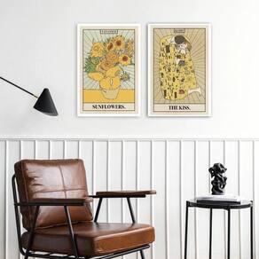 Kit 2 quadros cartas tarot klimt e van gogh 33x24cm Moldura: madeira branca Informações do produto tire todas as suas dúvidas no descritivo abaixo: decoração para quarto, sala, cozinha, escritório, área gourmet e muito mais. Chega de paredes vazias medidas - cada peça tem 33x24cm a4 . Material do papel - papel fotográfico brilhante de altíssima resolução acabamento - todos os quadros são acompanhados de uma película de acetato para proteção da imagem. - os quadros são embalados de forma segura com plástico bolha com camada dupla de acordo com o tamanho dos quadros. Garantia - garantia de 3 meses. Meu quadro chegou. Como posso fixá-lo Você precisa apenas de um martelo e um prego, pois os quadros já vão acompanhados de penduradores. Esta é a forma mais indicada. Caso prefira, você pode utilizar uma fita dupla face neste caso, sugerimos de alta qualidade para evitar que descole e seu quadro caia . Como posso limpar meu quadro A limpeza é feita como um móvel comum da sua casa. Apenas um pano seco ou espanador são suficientes para tal