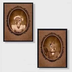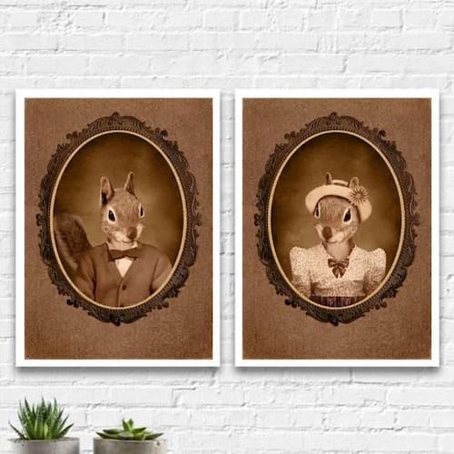 Kit 2 quadros casal de esquilos vintage 33x24cm - com vidro Moldura: madeira preta Informações do produto tire todas as suas dúvidas no descritivo abaixo: decoração para quarto, sala, cozinha, escritório, área gourmet e muito mais. Chega de paredes vazias medidas - cada peça tem 33x24cm a4 . Material do papel - papel fotográfico brilhante de altíssima resolução acabamento - todos os quadros são acompanhados de vidro para proteção da imagem. - moldura em madeira maciça na cor preta e pendurador . - os quadros são embalados de forma segura com plástico bolha com camada dupla de acordo com o tamanho dos quadros. Garantia - garantia de 3 meses. Meu quadro chegou. Como posso fixá-lo Você precisa apenas de um martelo e um prego, pois os quadros já vão acompanhados de penduradores. Esta é a forma mais indicada. Como posso limpar meu quadro A limpeza é feita como um móvel comum da sua casa. Apenas um pano seco ou espanador são suficientes para tal