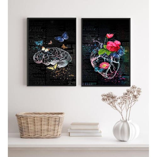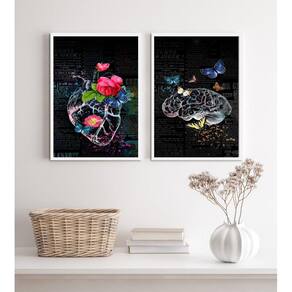 Kit 2 quadros cérebro coração- flores e borboletas 33x24cm - com vidro Moldura: madeira branca Informações do produto tire todas as suas dúvidas no descritivo abaixo: decoração para quarto, sala, cozinha, escritório, área gourmet e muito mais. Chega de paredes vazias medidas - cada peça tem 33x24cm a4 . Material do papel - papel fotográfico brilhante de altíssima resolução acabamento - todos os quadros são acompanhados de vidro para proteção da imagem. - moldura em madeira maciça na cor preta ou branca conforme produto escolhido e pendurador . - os quadros são embalados de forma segura com plástico bolha com camada dupla de acordo com o tamanho dos quadros. Garantia - garantia de 3 meses. Meu quadro chegou. Como posso fixá-lo Você precisa apenas de um martelo e um prego, pois os quadros já vão acompanhados de penduradores. Esta é a forma mais indicada. Como posso limpar meu quadro A limpeza é feita como um móvel comum da sua casa. Apenas um pano seco ou espanador são suficientes para tal Ean: 7897202734139