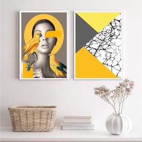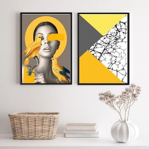 Especificações técnicas: - Título: Kit 2 Quadros Cinza e Amarelo Mulher Pássaros Abstrato - Medidas: 24x18cm A5 - Material do papel: Papel fotográfico brilhante de altíssima resolução - Moldura: Madeira branca - Acompanha vidro para proteção da imagem - Pendurador incluso - Embalagem segura com plástico bolha