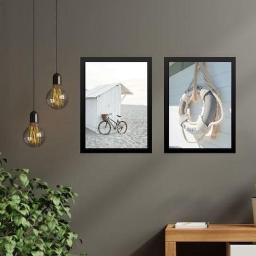 Kit 2 quadros coleção praia - boia e bicicleta 33x24cm Moldura: madeira branca Informações do produto tire todas as suas dúvidas no descritivo abaixo: decoração para quarto, sala, cozinha, escritório, área gourmet e muito mais. Chega de paredes vazias medidas - cada peça tem 33x24cm a4 . Material do papel - papel fotográfico brilhante de altíssima resolução acabamento - todos os quadros são acompanhados de uma película de acetato para proteção da imagem. - os quadros são embalados de forma segura com plástico bolha com camada dupla de acordo com o tamanho dos quadros. Garantia - garantia de 3 meses. Meu quadro chegou. Como posso fixá-lo Você precisa apenas de um martelo e um prego, pois os quadros já vão acompanhados de penduradores. Esta é a forma mais indicada. Caso prefira, você pode utilizar uma fita dupla face neste caso, sugerimos de alta qualidade para evitar que descole e seu quadro caia . Como posso limpar meu quadro A limpeza é feita como um móvel comum da sua casa. Apenas um pano seco ou espanador são suficientes para tal