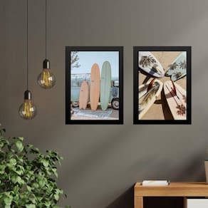 Kit 2 quadros coleção praia soft surf 45x34cm Moldura: madeira preta Informações do produto tire todas as suas dúvidas no descritivo abaixo: decoração para quarto, sala, cozinha, escritório, área gourmet e muito mais. Chega de paredes vazias. Medidas - cada peça tem 45x34cm a3 . Material do papel - papel fotográfico brilhante de altíssima resolução acabamento - todos os quadros são acompanhados de uma película de acetato para proteção da imagem. - os quadros são embalados de forma segura com plástico bolha com camada dupla de acordo com o tamanho dos quadros. Garantia - garantia de 3 meses. Meu quadro chegou. Como posso fixá-lo Você precisa apenas de um martelo e um prego, pois os quadros já vão acompanhados de penduradores. Esta é a forma mais indicada. Caso prefira, você pode utilizar uma fita dupla face neste caso, sugerimos de alta qualidade para evitar que descole e seu quadro caia . Como posso limpar meu quadro A limpeza é feita como um móvel comum da sua casa. Apenas um pano seco ou espanador são suficientes para tal