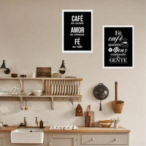 Kit 2 quadros cozinha café com fé 33x24cm - com vidro Moldura: madeira branca Informações do produto tire todas as suas dúvidas no descritivo abaixo: decoração para quarto, sala, cozinha, escritório, área gourmet e muito mais. Chega de paredes vazias medidas - cada peça tem 33x24cm a4 . Material do papel - papel fotográfico brilhante de altíssima resolução acabamento - todos os quadros são acompanhados de vidro para proteção da imagem. - moldura em madeira maciça na cor preta ou branca conforme produto escolhido e pendurador . - os quadros são embalados de forma segura com plástico bolha com camada dupla de acordo com o tamanho dos quadros. Garantia - garantia de 3 meses. Meu quadro chegou. Como posso fixá-lo Você precisa apenas de um martelo e um prego, pois os quadros já vão acompanhados de penduradores. Esta é a forma mais indicada. Como posso limpar meu quadro A limpeza é feita como um móvel comum da sua casa. Apenas um pano seco ou espanador são suficientes para tal