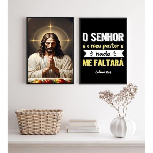 Kit 2 quadros para cozinha o senhor é meu pastor 24x18cm - com vidro Moldura: madeira preta Informações do produto tire todas as suas dúvidas no descritivo abaixo: decoração para quarto, sala, cozinha, escritório, área gourmet e muito mais. Chega de paredes vazias medidas - cada peça tem 24x18cm a5 . Material do papel - papel fotográfico brilhante de altíssima resolução acabamento - todos os quadros são acompanhados de vidro para proteção da imagem. - moldura em madeira maciça na cor preta ou branca conforme produto escolhido e pendurador . - os quadros são embalados de forma segura com plástico bolha com camada dupla de acordo com o tamanho dos quadros. Garantia - garantia de 3 meses. Meu quadro chegou. Como posso fixá-lo Você precisa apenas de um martelo e um prego, pois os quadros já vão acompanhados de penduradores. Esta é a forma mais indicada. Como posso limpar meu quadro A limpeza é feita como um móvel comum da sua casa. Apenas um pano seco ou espanador são suficientes para tal Ean: 7890133479285