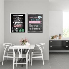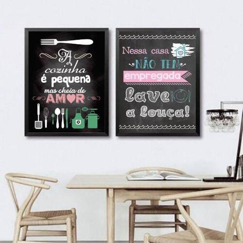 Kit 2 quadros cozinha pequena - lave a louça 24x18cm - com vidro Moldura: madeira branca Informações do produto tire todas as suas dúvidas no descritivo abaixo: decoração para quarto, sala, cozinha, escritório, área gourmet e muito mais. Chega de paredes vazias medidas - cada peça tem 24x18cm a5 . Material do papel - papel fotográfico brilhante de altíssima resolução acabamento - todos os quadros são acompanhados de vidro para proteção da imagem. - moldura em madeira maciça na cor preta ou branca conforme produto escolhido e pendurador . - os quadros são embalados de forma segura com plástico bolha com camada dupla de acordo com o tamanho dos quadros. Garantia - garantia de 3 meses. Meu quadro chegou. Como posso fixá-lo Você precisa apenas de um martelo e um prego, pois os quadros já vão acompanhados de penduradores. Esta é a forma mais indicada. Como posso limpar meu quadro A limpeza é feita como um móvel comum da sua casa. Apenas um pano seco ou espanador são suficientes para tal
