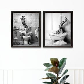 Kit 2 quadros decoração banheiro - girafas 24x18cm Moldura: madeira branca Informações do produto tire todas as suas dúvidas no descritivo abaixo: decoração para quarto, sala, cozinha, escritório, área gourmet e muito mais. Chega de paredes vazias medidas - cada peça tem 24x18cm a5 . Material do papel - papel fotográfico brilhante de altíssima resolução acabamento - todos os quadros são acompanhados de uma película de acetato para proteção da imagem. - os quadros são embalados de forma segura com plástico bolha com camada dupla de acordo com o tamanho dos quadros. Garantia - garantia de 3 meses. Meu quadro chegou. Como posso fixá-lo Você precisa apenas de um martelo e um prego, pois os quadros já vão acompanhados de penduradores. Esta é a forma mais indicada. Caso prefira, você pode utilizar uma fita dupla face neste caso, sugerimos de alta qualidade para evitar que descole e seu quadro caia . Como posso limpar meu quadro A limpeza é feita como um móvel comum da sua casa. Apenas um pano seco ou espanador são suficientes para tal