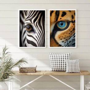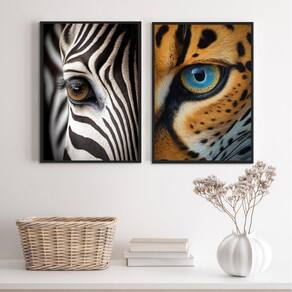 Kit 2 quadros decorativos olhos de animais 33x24cm - com vidro Moldura: madeira preta Informações do produto tire todas as suas dúvidas no descritivo abaixo: decoração para quarto, sala, cozinha, escritório, área gourmet e muito mais. Chega de paredes vazias medidas - cada peça tem 33x24cm a4 . Material do papel - papel fotográfico brilhante de altíssima resolução acabamento - todos os quadros são acompanhados de vidro para proteção da imagem. - moldura em madeira maciça na cor preta ou branca conforme produto escolhido e pendurador . - os quadros são embalados de forma segura com plástico bolha com camada dupla de acordo com o tamanho dos quadros. Garantia - garantia de 3 meses. Meu quadro chegou. Como posso fixá-lo Você precisa apenas de um martelo e um prego, pois os quadros já vão acompanhados de penduradores. Esta é a forma mais indicada. Como posso limpar meu quadro A limpeza é feita como um móvel comum da sua casa. Apenas um pano seco ou espanador são suficientes para tal Ean: 7890547177470