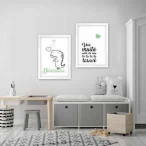 Kit 2 Quadros Dinossauro Ta Ta Ta Ta Taravô Verde A4 Kit com 2 Quadros Tamanho A4 24x32 cm cada; Fixação: Fitas dupla face para fixar em paredes lisas ou Fixadores convencionais para todo tipo de parede ; Cor da Moldura: Branca; Moldura: Feita em madeira de reflorestamento; Acabamento da moldura: Laqueada, fosca. Fundo: em Mdf; Acompanha Vidro para proteção da imagem; Impresso da arte: Em máxima qualidade em papel couchê premium de alta densidade e gramatura. Marca: Colou Tá Colado
