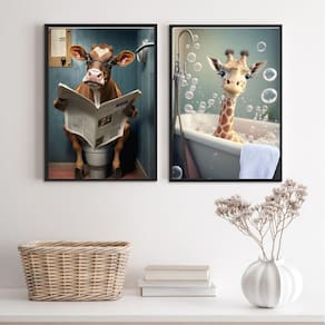 Kit 2 quadros divertidos para banheiro- bichinhos 24x18cm - com vidro Moldura: madeira branca Informações do produto tire todas as suas dúvidas no descritivo abaixo: decoração para quarto, sala, cozinha, escritório, área gourmet e muito mais. Chega de paredes vazias medidas - cada peça tem 24x18cm a5 . Material do papel - papel fotográfico brilhante de altíssima resolução acabamento - todos os quadros são acompanhados de vidro para proteção da imagem. - moldura em madeira maciça na cor preta ou branca conforme produto escolhido e pendurador . - os quadros são embalados de forma segura com plástico bolha com camada dupla de acordo com o tamanho dos quadros. Garantia - garantia de 3 meses. Meu quadro chegou. Como posso fixá-lo Você precisa apenas de um martelo e um prego, pois os quadros já vão acompanhados de penduradores. Esta é a forma mais indicada. Como posso limpar meu quadro A limpeza é feita como um móvel comum da sua casa. Apenas um pano seco ou espanador são suficientes para tal Ean: 7891441625593