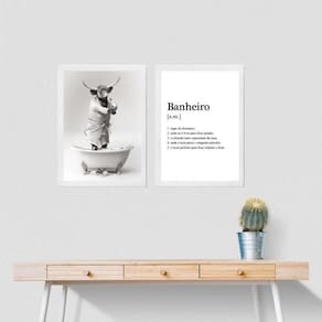 Kit 2 quadros divertidos banheiro - boi 45x34cm - com vidro Moldura: madeira branca Informações do produto tire todas as suas dúvidas no descritivo abaixo: decoração para quarto, sala, cozinha, escritório, área gourmet e muito mais. Chega de paredes vazias medidas - cada peça tem 45x34cm a3 . Material do papel - papel fotográfico brilhante de altíssima resolução acabamento - todos os quadros são acompanhados de vidro para proteção da imagem. - moldura em madeira maciça na cor preta ou branca conforme produto escolhido e pendurador . - os quadros são embalados de forma segura com plástico bolha com camada dupla de acordo com o tamanho dos quadros. Garantia - garantia de 3 meses. Meu quadro chegou. Como posso fixá-lo Você precisa apenas de um martelo e um prego, pois os quadros já vão acompanhados de penduradores. Esta é a forma mais indicada. Como posso limpar meu quadro A limpeza é feita como um móvel comum da sua casa. Apenas um pano seco ou espanador são suficientes para tal