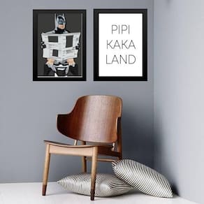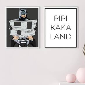 Kit 2 quadros divertidos banheiro herói no vaso 24x18cm Moldura: madeira preta Informações do produto tire todas as suas dúvidas no descritivo abaixo: decoração para quarto, sala, cozinha, escritório, área gourmet e muito mais. Chega de paredes vazias medidas - cada peça tem 24x18cm a5 . Material do papel - papel fotográfico brilhante de altíssima resolução acabamento - todos os quadros são acompanhados de uma película de acetato para proteção da imagem. - os quadros são embalados de forma segura com plástico bolha com camada dupla de acordo com o tamanho dos quadros. Garantia - garantia de 3 meses. Meu quadro chegou. Como posso fixá-lo Você precisa apenas de um martelo e um prego, pois os quadros já vão acompanhados de penduradores. Esta é a forma mais indicada. Caso prefira, você pode utilizar uma fita dupla face neste caso, sugerimos de alta qualidade para evitar que descole e seu quadro caia . Como posso limpar meu quadro A limpeza é feita como um móvel comum da sua casa. Apenas um pano seco ou espanador são suficientes para tal
