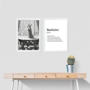 Kit 2 quadros divertidos banheiro - lhama 33x24cm Moldura: madeira branca Informações do produto tire todas as suas dúvidas no descritivo abaixo: decoração para quarto, sala, cozinha, escritório, área gourmet e muito mais. Chega de paredes vazias medidas - cada peça tem 33x24cm a4 . Material do papel - papel fotográfico brilhante de altíssima resolução acabamento - todos os quadros são acompanhados de uma película de acetato para proteção da imagem. - os quadros são embalados de forma segura com plástico bolha com camada dupla de acordo com o tamanho dos quadros. Garantia - garantia de 3 meses. Meu quadro chegou. Como posso fixá-lo Você precisa apenas de um martelo e um prego, pois os quadros já vão acompanhados de penduradores. Esta é a forma mais indicada. Caso prefira, você pode utilizar uma fita dupla face neste caso, sugerimos de alta qualidade para evitar que descole e seu quadro caia . Como posso limpar meu quadro A limpeza é feita como um móvel comum da sua casa. Apenas um pano seco ou espanador são suficientes para tal Ean: 7893472164379