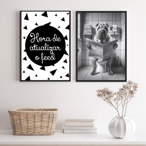 Kit 2 quadros engraçados banheiro - sharpeei 33x24cm Moldura: madeira preta Informações do produto tire todas as suas dúvidas no descritivo abaixo: decoração para quarto, sala, cozinha, escritório, área gourmet e muito mais. Chega de paredes vazias medidas - cada peça tem 33x24cm a4 . Material do papel - papel fotográfico brilhante de altíssima resolução acabamento - todos os quadros são acompanhados de uma película de acetato para proteção da imagem. - os quadros são embalados de forma segura com plástico bolha com camada dupla de acordo com o tamanho dos quadros. Garantia - garantia de 3 meses. Meu quadro chegou. Como posso fixá-lo Você precisa apenas de um martelo e um prego, pois os quadros já vão acompanhados de penduradores. Esta é a forma mais indicada. Caso prefira, você pode utilizar uma fita dupla face neste caso, sugerimos de alta qualidade para evitar que descole e seu quadro caia . Como posso limpar meu quadro A limpeza é feita como um móvel comum da sua casa. Apenas um pano seco ou espanador são suficientes para tal