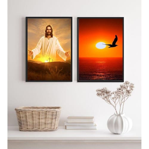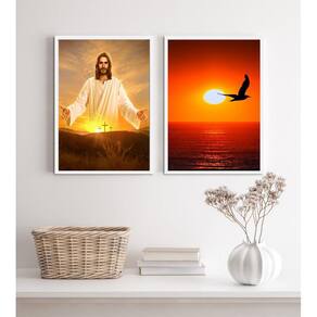 Kit 2 quadros evangélicos jesus por do sol 45x34cm - com vidro Moldura: madeira branca Informações do produto tire todas as suas dúvidas no descritivo abaixo: decoração para quarto, sala, cozinha, escritório, área gourmet e muito mais. Chega de paredes vazias medidas - cada peça tem 45x34cm a3 . Material do papel - papel fotográfico brilhante de altíssima resolução acabamento - todos os quadros são acompanhados de vidro para proteção da imagem. - moldura em madeira maciça na cor preta ou branca conforme produto escolhido e pendurador . - os quadros são embalados de forma segura com plástico bolha com camada dupla de acordo com o tamanho dos quadros. Garantia - garantia de 3 meses. Meu quadro chegou. Como posso fixá-lo Você precisa apenas de um martelo e um prego, pois os quadros já vão acompanhados de penduradores. Esta é a forma mais indicada. Como posso limpar meu quadro A limpeza é feita como um móvel comum da sua casa. Apenas um pano seco ou espanador são suficientes para tal Ean: 7899674675101