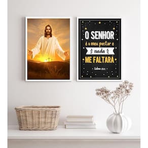 Kit 2 quadros evangélicos o senhor é meu pastor- jesus 45x34cm Moldura: madeira preta Informações do produto tire todas as suas dúvidas no descritivo abaixo: decoração para quarto, sala, cozinha, escritório, área gourmet e muito mais. Chega de paredes vazias. Medidas - cada peça tem 45x34cm a3 . Material do papel - papel fotográfico brilhante de altíssima resolução acabamento - todos os quadros são acompanhados de uma película de acetato para proteção da imagem. - os quadros são embalados de forma segura com plástico bolha com camada dupla de acordo com o tamanho dos quadros. Garantia - garantia de 3 meses. Meu quadro chegou. Como posso fixá-lo Você precisa apenas de um martelo e um prego, pois os quadros já vão acompanhados de penduradores. Esta é a forma mais indicada. Caso prefira, você pode utilizar uma fita dupla face neste caso, sugerimos de alta qualidade para evitar que descole e seu quadro caia . Como posso limpar meu quadro A limpeza é feita como um móvel comum da sua casa. Apenas um pano seco ou espanador são suficientes para tal Ean: 7891509595998