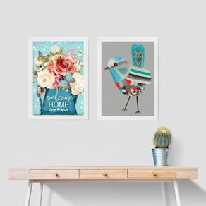 Kit 2 quadros flores e passarinho - welcome 24x18cm - com vidro Moldura: madeira preta Informações do produto tire todas as suas dúvidas no descritivo abaixo: decoração para quarto, sala, cozinha, escritório, área gourmet e muito mais. Chega de paredes vazias medidas - cada peça tem 24x18cm a5 . Material do papel - papel fotográfico brilhante de altíssima resolução acabamento - todos os quadros são acompanhados de vidro para proteção da imagem. - moldura em madeira maciça na cor preta ou branca conforme produto escolhido e pendurador . - os quadros são embalados de forma segura com plástico bolha com camada dupla de acordo com o tamanho dos quadros. Garantia - garantia de 3 meses. Meu quadro chegou. Como posso fixá-lo Você precisa apenas de um martelo e um prego, pois os quadros já vão acompanhados de penduradores. Esta é a forma mais indicada. Como posso limpar meu quadro A limpeza é feita como um móvel comum da sua casa. Apenas um pano seco ou espanador são suficientes para tal