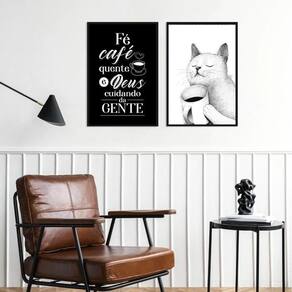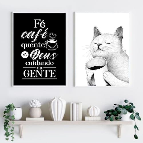 Kit 2 quadros gatinho café amor e fé 33x24cm - com vidro Moldura: madeira preta Informações do produto tire todas as suas dúvidas no descritivo abaixo: decoração para quarto, sala, cozinha, escritório, área gourmet e muito mais. Chega de paredes vazias medidas - cada peça tem 33x24cm a4 . Material do papel - papel fotográfico brilhante de altíssima resolução acabamento - todos os quadros são acompanhados de vidro para proteção da imagem. - moldura em madeira maciça na cor preta ou branca conforme produto escolhido e pendurador . - os quadros são embalados de forma segura com plástico bolha com camada dupla de acordo com o tamanho dos quadros. Garantia - garantia de 3 meses. Meu quadro chegou. Como posso fixá-lo Você precisa apenas de um martelo e um prego, pois os quadros já vão acompanhados de penduradores. Esta é a forma mais indicada. Como posso limpar meu quadro A limpeza é feita como um móvel comum da sua casa. Apenas um pano seco ou espanador são suficientes para tal