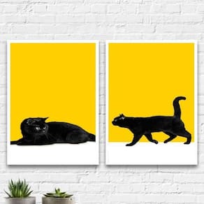 Kit 2 quadros gato preto fundo amarelo 45x34cm - com vidro Moldura: madeira preta Informações do produto tire todas as suas dúvidas no descritivo abaixo: decoração para quarto, sala, cozinha, escritório, área gourmet e muito mais. Chega de paredes vazias medidas - cada peça tem 45x34cm a3 . Material do papel - papel fotográfico brilhante de altíssima resolução acabamento - todos os quadros são acompanhados de vidro para proteção da imagem. - moldura em madeira maciça na cor preta e pendurador . - os quadros são embalados de forma segura com plástico bolha com camada dupla de acordo com o tamanho dos quadros. - de 3 meses. Meu quadro chegou. Como posso fixá-lo Você precisa apenas de um martelo e um prego, pois os quadros já vão acompanhados de penduradores. Esta é a forma mais indicada. Como posso limpar meu quadro A limpeza é feita como um móvel comum da sua casa. Apenas um pano seco ou espanador são suficientes para tal