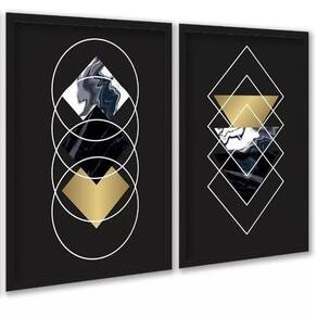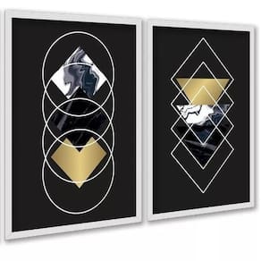 Kit 2 quadros geométricos preto dourado mármore 45x34cm - com vidro Cor: moldura preta Informações do produto tire todas as suas dúvidas no descritivo abaixo: decoração para quarto, sala, cozinha, escritório, área gourmet e muito mais. Chega de paredes vazias medidas - cada peça tem 45x34cm a3 . Material do papel - papel fotográfico brilhante de altíssima resolução acabamento - todos os quadros são acompanhados de vidro para proteção da imagem. - moldura em madeira maciça na cor preta ou branca conforme produto escolhido e pendurador . - os quadros são embalados de forma segura com plástico bolha com camada dupla de acordo com o tamanho dos quadros. - de 3 meses. Meu quadro chegou. Como posso fixá-lo Você precisa apenas de um martelo e um prego, pois os quadros já vão acompanhados de penduradores. Esta é a forma mais indicada. Como posso limpar meu quadro A limpeza é feita como um móvel comum da sua casa. Apenas um pano seco ou espanador são suficientes para tal