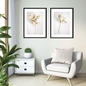 Kit 2 quadros grandes flores branca dourado - 60x48cm Moldura: madeira preta Informações do produto tire todas as suas dúvidas no descritivo abaixo: decoração para quarto, sala, cozinha, escritório, área gourmet e muito mais. Chega de paredes vazias medidas - cada peça tem 60x48cm . Material do papel - papel fotográfico brilhante de altíssima resolução acabamento - todos os quadros são acompanhados de vidro para proteção da imagem. - moldura em madeira maciça na cor preta ou branca conforme produto escolhido e pendurador. - paspatur branco com 7cm de largura - os quadros são embalados de forma segura com plástico bolha com camada dupla de acordo com o tamanho dos quadros. Garantia - garantia de 3 meses. Meu quadro chegou. Como posso fixá-lo Você precisa apenas de um martelo e um prego, pois os quadros já vão acompanhados de penduradores. Esta é a forma mais indicada. Como posso limpar meu quadro A limpeza é feita como um móvel comum da sua casa. Apenas um pano seco ou espanador são suficientes para tal Ean: 7894334690241