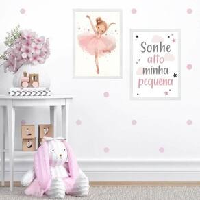 Kit 2 quadros infantis bailarina - sonhe alto 24x18cm Moldura: madeira branca Informações do produto tire todas as suas dúvidas no descritivo abaixo: decoração para quarto, sala, cozinha, escritório, área gourmet e muito mais. Chega de paredes vazias medidas - cada peça tem 24x18cm a5 . Material do papel - papel fotográfico brilhante de altíssima resolução acabamento - todos os quadros são acompanhados de uma película de acetato para proteção da imagem. - os quadros são embalados de forma segura com plástico bolha com camada dupla de acordo com o tamanho dos quadros. Garantia - garantia de 3 meses. Meu quadro chegou. Como posso fixá-lo Você precisa apenas de um martelo e um prego, pois os quadros já vão acompanhados de penduradores. Esta é a forma mais indicada. Caso prefira, você pode utilizar uma fita dupla face neste caso, sugerimos de alta qualidade para evitar que descole e seu quadro caia . Como posso limpar meu quadro A limpeza é feita como um móvel comum da sua casa. Apenas um pano seco ou espanador são suficientes para tal