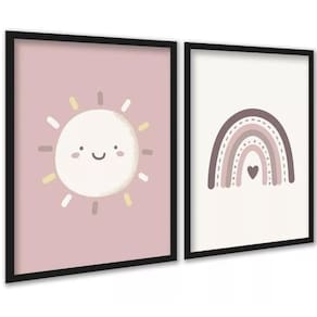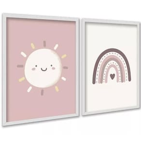 Kit 2 quadros infantis sol e arco-íris rosê 45x34cm - com vidro Cor: moldura branca Informações do produto tire todas as suas dúvidas no descritivo abaixo: decoração para quarto, sala, cozinha, escritório, área gourmet e muito mais. Chega de paredes vazias medidas - cada peça tem 45x34cm a3 . Material do papel - papel fotográfico brilhante de altíssima resolução acabamento - todos os quadros são acompanhados de vidro para proteção da imagem. - moldura em madeira maciça na cor preta ou branca conforme produto escolhido e pendurador . - os quadros são embalados de forma segura com plástico bolha com camada dupla de acordo com o tamanho dos quadros. - de 3 meses. Meu quadro chegou. Como posso fixá-lo Você precisa apenas de um martelo e um prego, pois os quadros já vão acompanhados de penduradores. Esta é a forma mais indicada. Como posso limpar meu quadro A limpeza é feita como um móvel comum da sua casa. Apenas um pano seco ou espanador são suficientes para tal