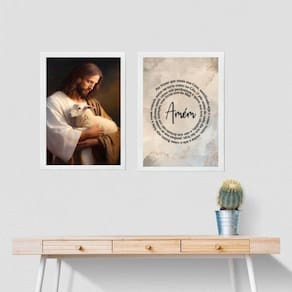 Kit 2 quadros jesus com ovelha - pai nosso 24x18cm - com vidro Moldura: madeira preta Informações do produto tire todas as suas dúvidas no descritivo abaixo: decoração para quarto, sala, cozinha, escritório, área gourmet e muito mais. Chega de paredes vazias medidas - cada peça tem 24x18cm a5 . Material do papel - papel fotográfico brilhante de altíssima resolução acabamento - todos os quadros são acompanhados de vidro para proteção da imagem. - moldura em madeira maciça na cor preta ou branca conforme produto escolhido e pendurador . - os quadros são embalados de forma segura com plástico bolha com camada dupla de acordo com o tamanho dos quadros. Garantia - garantia de 3 meses. Meu quadro chegou. Como posso fixá-lo Você precisa apenas de um martelo e um prego, pois os quadros já vão acompanhados de penduradores. Esta é a forma mais indicada. Como posso limpar meu quadro A limpeza é feita como um móvel comum da sua casa. Apenas um pano seco ou espanador são suficientes para tal