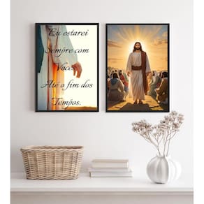 Kit 2 quadros jesus- eu estarei sempre com vocês 33x24cm Moldura: madeira preta Informações do produto tire todas as suas dúvidas no descritivo abaixo: decoração para quarto, sala, cozinha, escritório, área gourmet e muito mais. Chega de paredes vazias medidas - cada peça tem 33x24cm a4 . Material do papel - papel fotográfico brilhante de altíssima resolução acabamento - todos os quadros são acompanhados de uma película de acetato para proteção da imagem. - os quadros são embalados de forma segura com plástico bolha com camada dupla de acordo com o tamanho dos quadros. Garantia - garantia de 3 meses. Meu quadro chegou. Como posso fixá-lo Você precisa apenas de um martelo e um prego, pois os quadros já vão acompanhados de penduradores. Esta é a forma mais indicada. Caso prefira, você pode utilizar uma fita dupla face neste caso, sugerimos de alta qualidade para evitar que descole e seu quadro caia . Como posso limpar meu quadro A limpeza é feita como um móvel comum da sua casa. Apenas um pano seco ou espanador são suficientes para tal Ean: 7895923197349