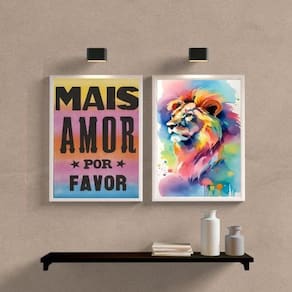 O Kit 2 Quadros Leão Aquarela Mais Amor Por Favor 24X18Cm é perfeito para decorar seu quarto, sala, cozinha, escritório, área gourmet e muito mais. Com medidas de 24x18cm A5 , cada peça é produzida em papel fotográfico brilhante de altíssima resolução, garantindo imagens nítidas e vibrantes.