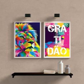 O Kit 2 Quadros Leão Colorido Gratidão 24X18Cm é perfeito para decorar qualquer ambiente da sua casa. Com moldura de madeira branca, esses quadros trazem uma atmosfera alegre e inspiradora para o seu quarto, sala, cozinha, escritório, área gourmet e muito mais.