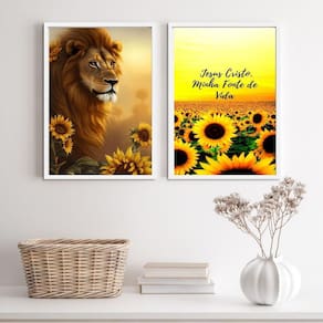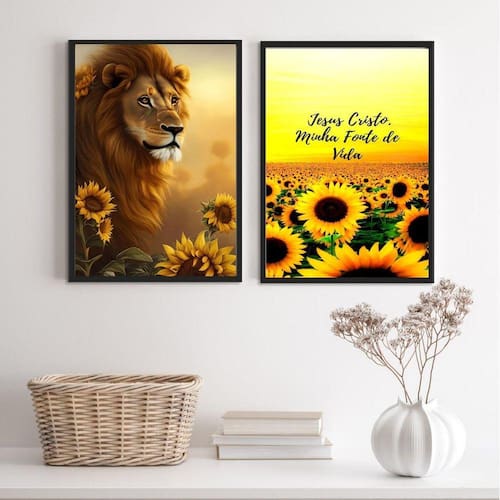 Se você está procurando por uma decoração única e especial, não deixe de adquirir o Kit 2 Quadros Leão Jesus Cristo Girassóis 33X24Cm - Vidro. Com sua bela imagem e excelente qualidade, eles com certeza vão dar um toque especial ao ambiente Ean: 7890077908759