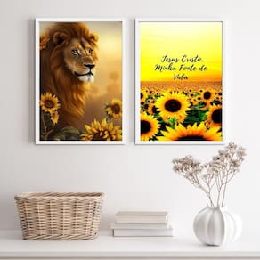 O Kit 2 Quadros Leão Jesus Cristo Girassóis 33X24Cm é perfeito para quem deseja dar um toque especial na decoração de diversos ambientes, como quarto, sala, cozinha, escritório, área gourmet e muito mais. Os quadros possuem moldura de madeira branca, conferindo um visual elegante e sofisticado. Cada peça tem o tamanho de 33x24cm A4 , ideal para compor uma parede vazia. Feitos em papel fotográfico brilhante de altíssima resolução, os quadros apresentam uma imagem nítida e de qualidade. Além disso, eles são acompanhados de uma película de acetato para proteção da imagem, garantindo a durabilidade do produto. Para garantir que os quadros cheguem em perfeito estado, eles são embalados de forma segura com plástico bolha de camada dupla, de acordo com o tamanho dos quadros. Com de 3 meses, você pode ficar tranquilo ao adquirir o Kit 2 Quadros Leão Jesus Cristo Girassóis 33X24Cm. A fixação dos quadros é muito simples. Eles já vêm acompanhados de penduradores, sendo necessário apenas um martelo e um prego para fixá-los na parede. No entanto, se preferir, você também pode utilizar uma fita dupla face de alta qualidade para evitar que descolem e caiam. A limpeza dos quadros é muito prática. Basta utilizar um pano seco ou um espanador para remover a poeira, assim como você faria com qualquer móvel da sua casa. Adquira agora mesmo o Kit 2 Quadros Leão Jesus Cristo Girassóis 33X24Cm e deixe sua decoração ainda mais encantadora.