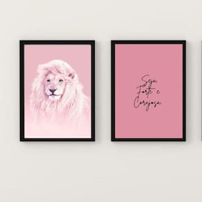 O Kit 2 Quadros Leão Rosa Seja Forte E Corajosa é perfeito para dar um toque especial na decoração de ambientes como quarto, sala, cozinha, escritório, área gourmet, entre outros. Chega de paredes vazias! Com medidas de 45x34cm A3 , cada peça é acompanhada de moldura de madeira branca, que proporciona um acabamento elegante e sofisticado.