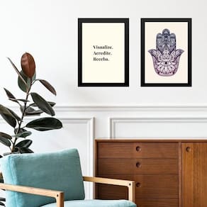 Kit 2 quadros lei atração - manifestação sonhos 33x24cm Cor: moldura preta Informações do produto tire todas as suas dúvidas no descritivo abaixo: decoração para quarto, sala, cozinha, escritório, área gourmet e muito mais. Chega de paredes vazias medidas - cada peça tem 33x24cm a4 . Material do papel - papel fotográfico brilhante de altíssima resolução acabamento - todos os quadros são acompanhados de uma película de acetato para proteção da imagem. - os quadros são embalados de forma segura com plástico bolha com camada dupla de acordo com o tamanho dos quadros. Garantia - garantia de 3 meses. Meu quadro chegou. Como posso fixá-lo Você precisa apenas de um martelo e um prego, pois os quadros já vão acompanhados de penduradores. Esta é a forma mais indicada. Caso prefira, você pode utilizar uma fita dupla face neste caso, sugerimos de alta qualidade para evitar que descole e seu quadro caia . Como posso limpar meu quadro A limpeza é feita como um móvel comum da sua casa. Apenas um pano seco ou espanador são suficientes para tal