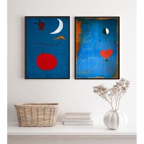 Kit 2 quadros miró azul e vermelho 33x24cm - com vidro Moldura: madeira preta Informações do produto tire todas as suas dúvidas no descritivo abaixo: decoração para quarto, sala, cozinha, escritório, área gourmet e muito mais. Chega de paredes vazias medidas - cada peça tem 33x24cm a4 . Material do papel - papel fotográfico brilhante de altíssima resolução acabamento - todos os quadros são acompanhados de vidro para proteção da imagem. - moldura em madeira maciça na cor preta ou branca conforme produto escolhido e pendurador . - os quadros são embalados de forma segura com plástico bolha com camada dupla de acordo com o tamanho dos quadros. Garantia - garantia de 3 meses. Meu quadro chegou. Como posso fixá-lo Você precisa apenas de um martelo e um prego, pois os quadros já vão acompanhados de penduradores. Esta é a forma mais indicada. Como posso limpar meu quadro A limpeza é feita como um móvel comum da sua casa. Apenas um pano seco ou espanador são suficientes para tal