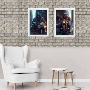 Kit 2 quadros motos - feras motociclistas 45x34cm - com vidro Moldura: madeira branca Informações do produto tire todas as suas dúvidas no descritivo abaixo: decoração para quarto, sala, cozinha, escritório, área gourmet e muito mais. Chega de paredes vazias medidas - cada peça tem 45x34cm a3 . Material do papel - papel fotográfico brilhante de altíssima resolução acabamento - todos os quadros são acompanhados de vidro para proteção da imagem. - moldura em madeira maciça na cor preta ou branca conforme produto escolhido e pendurador . - os quadros são embalados de forma segura com plástico bolha com camada dupla de acordo com o tamanho dos quadros. Garantia - garantia de 3 meses. Meu quadro chegou. Como posso fixá-lo Você precisa apenas de um martelo e um prego, pois os quadros já vão acompanhados de penduradores. Esta é a forma mais indicada. Como posso limpar meu quadro A limpeza é feita como um móvel comum da sua casa. Apenas um pano seco ou espanador são suficientes para tal