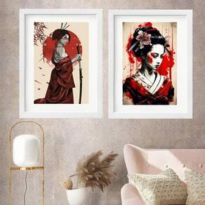 Kit 2 quadros mulheres samurai gueixa - 60x48cm Moldura: madeira branca Informações do produto tire todas as suas dúvidas no descritivo abaixo: decoração para quarto, sala, cozinha, escritório, área gourmet e muito mais. Chega de paredes vazias medidas - cada peça tem 60x48cm . Material do papel - papel fotográfico brilhante de altíssima resolução acabamento - todos os quadros são acompanhados de vidro para proteção da imagem. - moldura em madeira maciça na cor preta ou branca conforme produto escolhido e pendurador. - paspatur branco com 7cm de largura - os quadros são embalados de forma segura com plástico bolha com camada dupla de acordo com o tamanho dos quadros. Garantia - garantia de 3 meses. Meu quadro chegou. Como posso fixá-lo Você precisa apenas de um martelo e um prego, pois os quadros já vão acompanhados de penduradores. Esta é a forma mais indicada. Como posso limpar meu quadro A limpeza é feita como um móvel comum da sua casa. Apenas um pano seco ou espanador são suficientes para tal Ean: 7896951807507