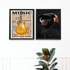 Kit 2 quadros music life - chimpanzé 24x18cm - com vidro Moldura: madeira branca Informações do produto tire todas as suas dúvidas no descritivo abaixo: decoração para quarto, sala, cozinha, escritório, área gourmet e muito mais. Chega de paredes vazias medidas - cada peça tem 24x18cm a5 . Material do papel - papel fotográfico brilhante de altíssima resolução acabamento - todos os quadros são acompanhados de vidro para proteção da imagem. - moldura em madeira maciça na cor preta ou branca conforme produto escolhido e pendurador . - os quadros são embalados de forma segura com plástico bolha com camada dupla de acordo com o tamanho dos quadros. Garantia - garantia de 3 meses. Meu quadro chegou. Como posso fixá-lo Você precisa apenas de um martelo e um prego, pois os quadros já vão acompanhados de penduradores. Esta é a forma mais indicada. Como posso limpar meu quadro A limpeza é feita como um móvel comum da sua casa. Apenas um pano seco ou espanador são suficientes para tal